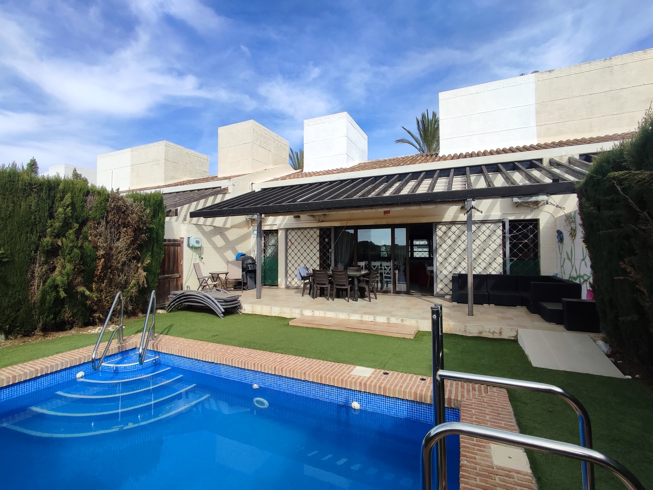 RESALE VILLA - A modern contemporary designed two-bedroom villa with high wooden ceilings, attractive low maintenance gardens with private pool. It has a large open plan lounge/dining room with windows both side allowing light to flood into the villa. There is a bathroom with shower off the lounge and on the opposite side through sliding doors is the kitchen. The large modern kitchen is very stylish and has good quality appliances fitted, and a door leading to a third room perfect for a third bedroom, study/office or snug. Back in the main lounge area there are large new tri-folding doors leading direct to the outside tiled terrace with seating area, sun loungers and a private pool. The 2 bedrooms are located either side of the lounge area and accessed through large sliding doors. They both have fitted wardrobes, individual air conditioning units and windows view pool views. The master bedroom leads to a new ensuite with walkin shower. At the front of the villa there is another large seating area and carport with an electric entrance gate. The front of the villa is East facing whilst the pool area is south west facing with views to the golf course (which is currently being resurfaced)KEY FEATURES3.5m x 5.5m Private Pool.Fully fitted kitchen. New tri fold patio doors.New ensuite.New hot and cold air conditioning throughout.Upgraded gas central heating.New combi gas boiler. Wooden beamed ceilings.Feature log burner fireplace.Outdoor lights.Outdoor water points.Landscaped garden.Private driveway with electric gate.LOCATION - The villas are a 25 minutes drive from the new Murcia International Airport and just over an hour from Alicante airport. Peraleja Golf is within 30 minutes from the lively cities of Murcia and Cartegena. The popular Spanish town of Sucina, made famous by A Place in the Sun TV program, is only 5 minutes by car and offers a good choice of bars and restaurants, two supermarkets, chemist, doctors, ironmongers, all everyday amenities. The tourist towns and beaches of Santiago de la Ribera, Lo Pagan and Los Alcazares are only 20 minutes away.UPDATE - Peraleja Golf Course, clubhouse and Piano Bar are currently closed, however it has been purchased by new investors and is on the pathway to a remarkable transformation, with renovations already underway on many of the unfinished properties. The golf course is expected to be well on the way to recovery towards the end of 2025 and may be in a condition ready for play in the first part of 2026. The new owners are also in active discussions with a number of interested parties for the reopening of the Clubhouse and Piano Bar. As part of the overall investment plan, the new owners now own much of the open area extending beyond the boundary of the golf course and are actively evaluating the opportunities for using that land as future recreational space. This is a great opportunity to buy a fantastic golf villa in the early stages of the redevelopment and secure it before the prices inevitably rise when the golf course, Clubhouse and Restaurant reopen.DON´T MISS THIS FANTASTIC INVESTMENT OPPORTUNITY