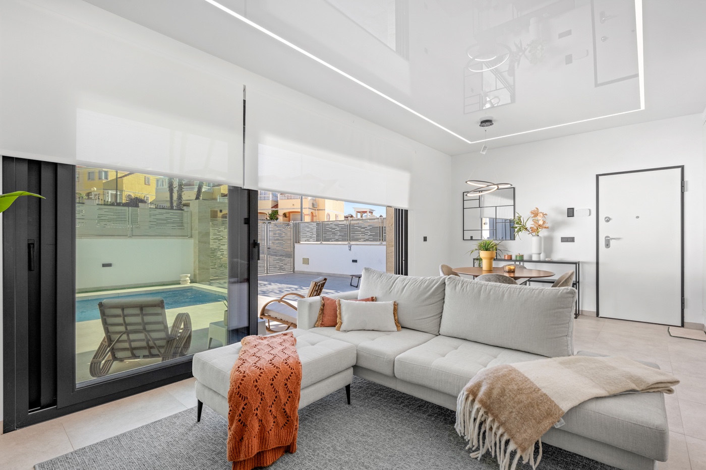 Belägen i det eftertraktade Blue Lagoon-området på Orihuela Costa, inom lättfödd gångavstånd till alla nära livets behov, finns denna imponerande villa – ursprungligen byggd som visningshus för projektet. Det märks direkt: högkvalitativa material, genomtänkt planlösning och en rad exklusiva tillägg som hemmaautomation, larm och elstyrda rullgardiner sätter standarden högt när det gäller komfort och stil. Den ljusa och generösa vardagsrummet öppnar sig smidigt mot en privat terrass med pool – en perfekt övergång mellan inom- och utomhusliv som inviterar till soliga dagar och underbara kvällar under stjärnhimlen. Här finns även utrymme för parkering direkt på tomten, säkert och bekvämt. På bottenvåningen finns en fullvärdig sovrum med angränsande badrum – idealiskt för gäster eller för den som föredrar allt på en nivå. Intill det välutrustade köket finns ett förråd med direktutgång till en västvänd terrass, perfekt för att njuta av eftermiddags- och kvällssolen. Via trappen nås övervåningen med två yttiga sovrum, var och en med eget privata badrum. Från denna nivå leder en andra trappa upp till en generös solterrass med fantastiska 360-gradersutsikt över det lugna och charmiga kvarteret – en riktig oas i himlen. Här kan du njuta av den andlöst vackra medelhavslandskapet och känna dig långt borta från vardagens stress. Villan säljs fullt inredd med högsta kvalitet på möblerna – klart att flytta in direkt och njuta. Sjö och det populära shoppingcentret La Zenia Boulevard är bara 10 minuters bilfärd bort, medan supermarknad, apotek och butiker ligger inom 3 minuters gångavstånd. Med sina 3 sovrum, 3 badrum och 116 m² boendeyta på en 177 m² stor tomt erbjuder denna fastighet både plats och exklusivitet – perfekt som helårshem, semesterboende eller investering i solen. Upptäck ditt nästa hem i solen med Real Estate by Gardewik – experter på lyxfastigheter på Costa Blanca sedan 1986.